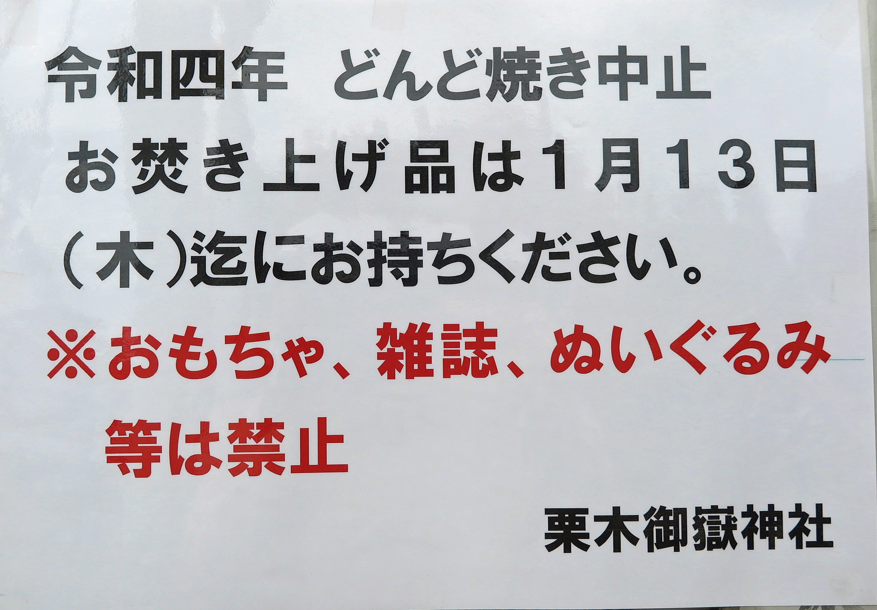 栗木御嶽神社は中止にしましたが、廃棄のお飾りは受け付けていたようです。しかし、琴平神社は駐車場で行いました。バス道路沿いにあるため混雑に巻き込まれて着火は見られませんでした。