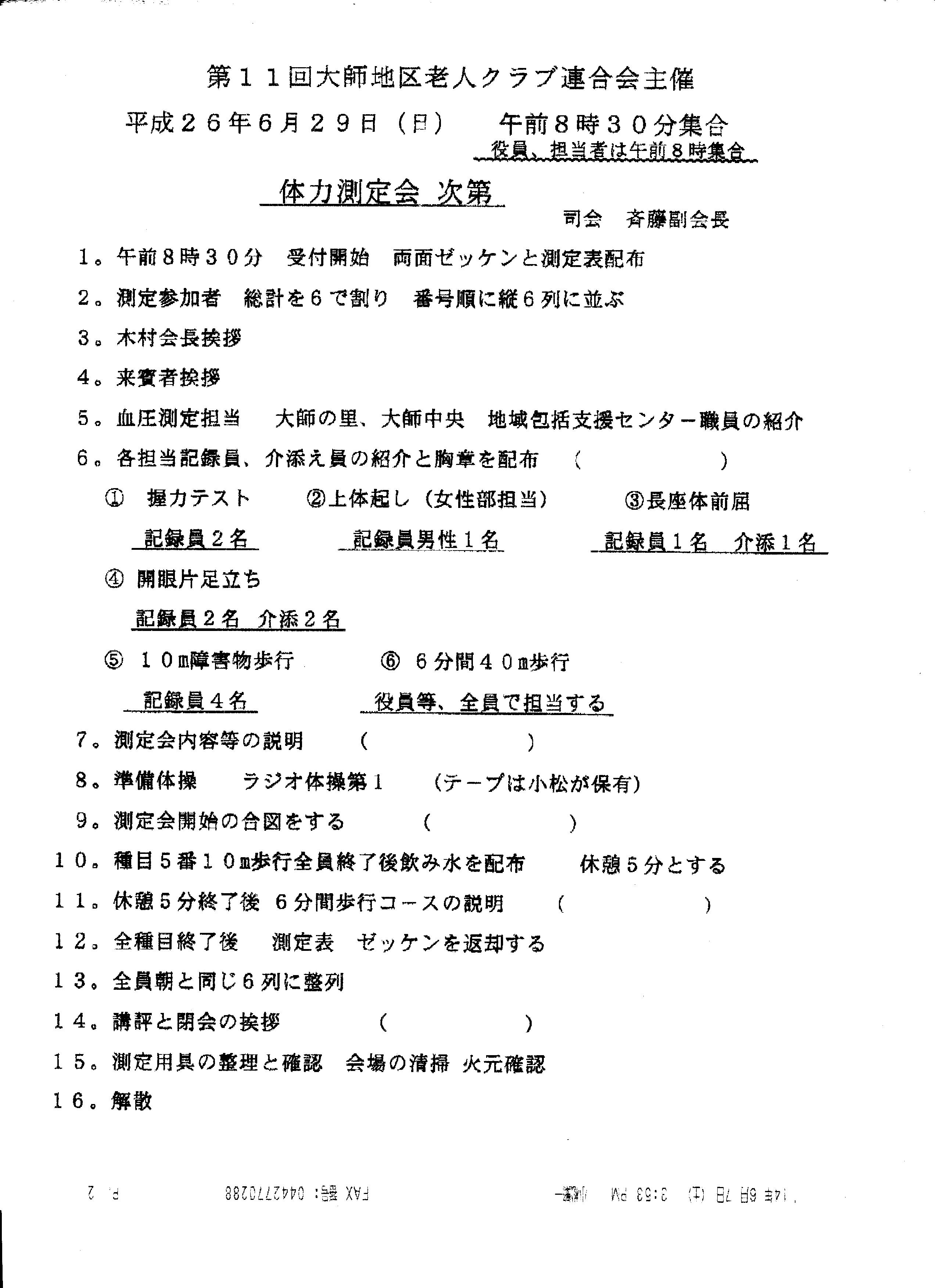 平成26年6月29日(日)川中島小学校体育館をお借りして、本年で11回目の開催となる大師地区老連第11回シニア体力測定会を「!!自分の体力を知って 毎日の暮らしを見直そう!!」の合言葉のもと、区老連の健康促進部が中心となり開催しました。