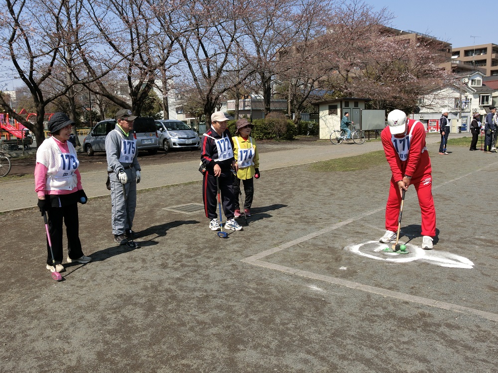 桜の花が五分咲きとはいえきれいに咲き誇り、風もなく穏やかな日差しのもとでのグランドゴルフ大会が小田多目的広場にて、兼次会長の挨拶、全員でのラジオ体操ののち、166名の参加者が真剣ななかにも楽しく和やかに行われました。
